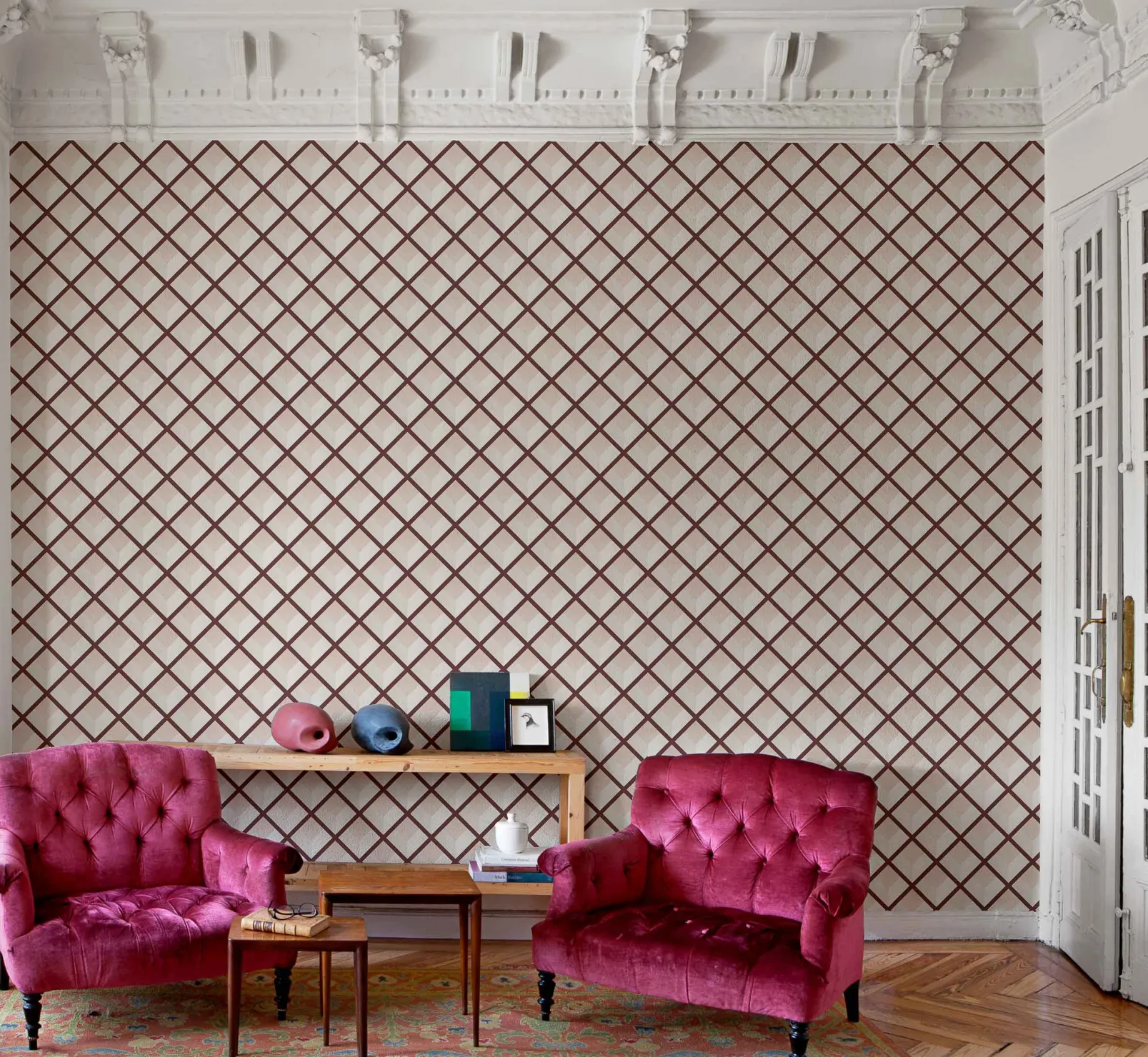 El papel pintado Vincent Wine de Coordonné es un diseño geométrico en tonos rojo/vino de la colección Core.