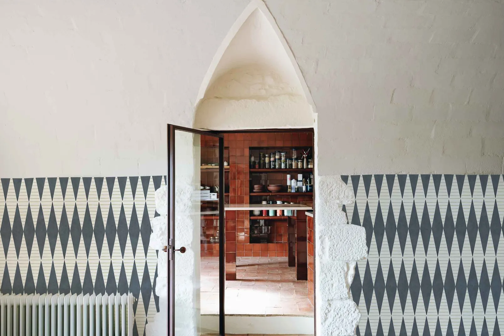 El papel pintado Warrior Añil de Coordonné es un diseño geométrico en tonos azules/azules de la colección Maasai.