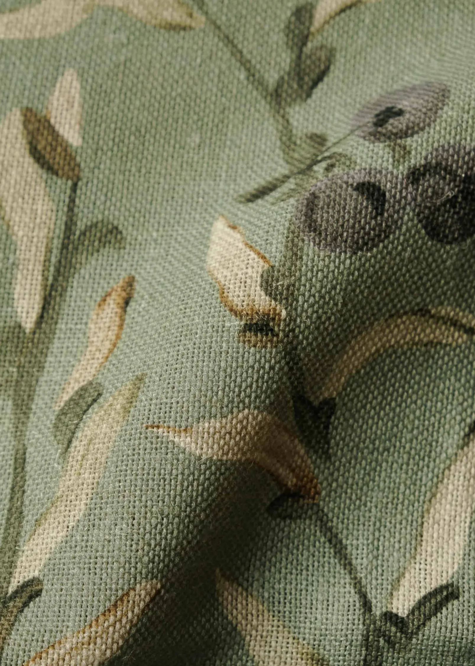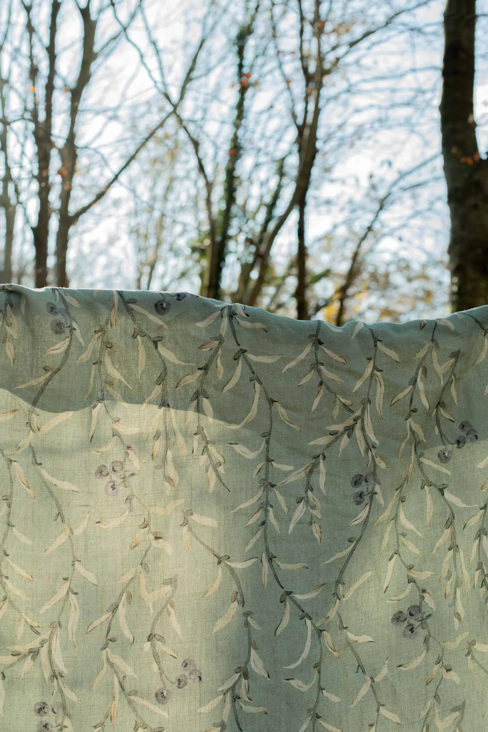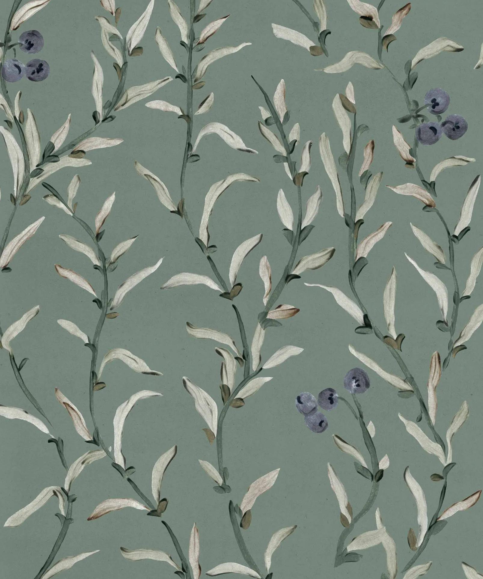 Wild Blackthorn Lagoon de Coordonné es un diseño floral en verde de la colección Cotswolds Fabrics. Irresistibles frutos destacan entre las delgadas y flexibles ramas de la zona de Somerset.