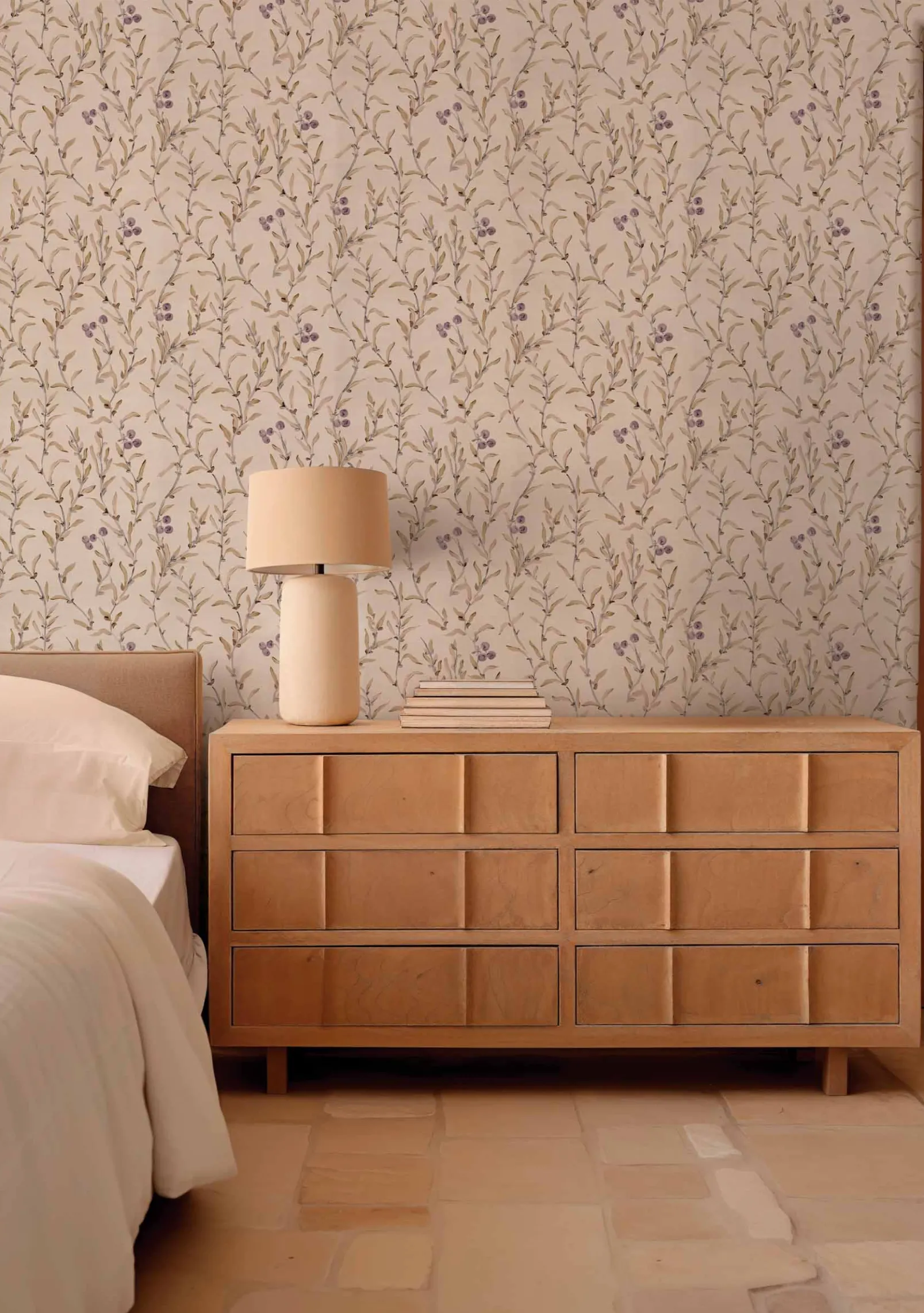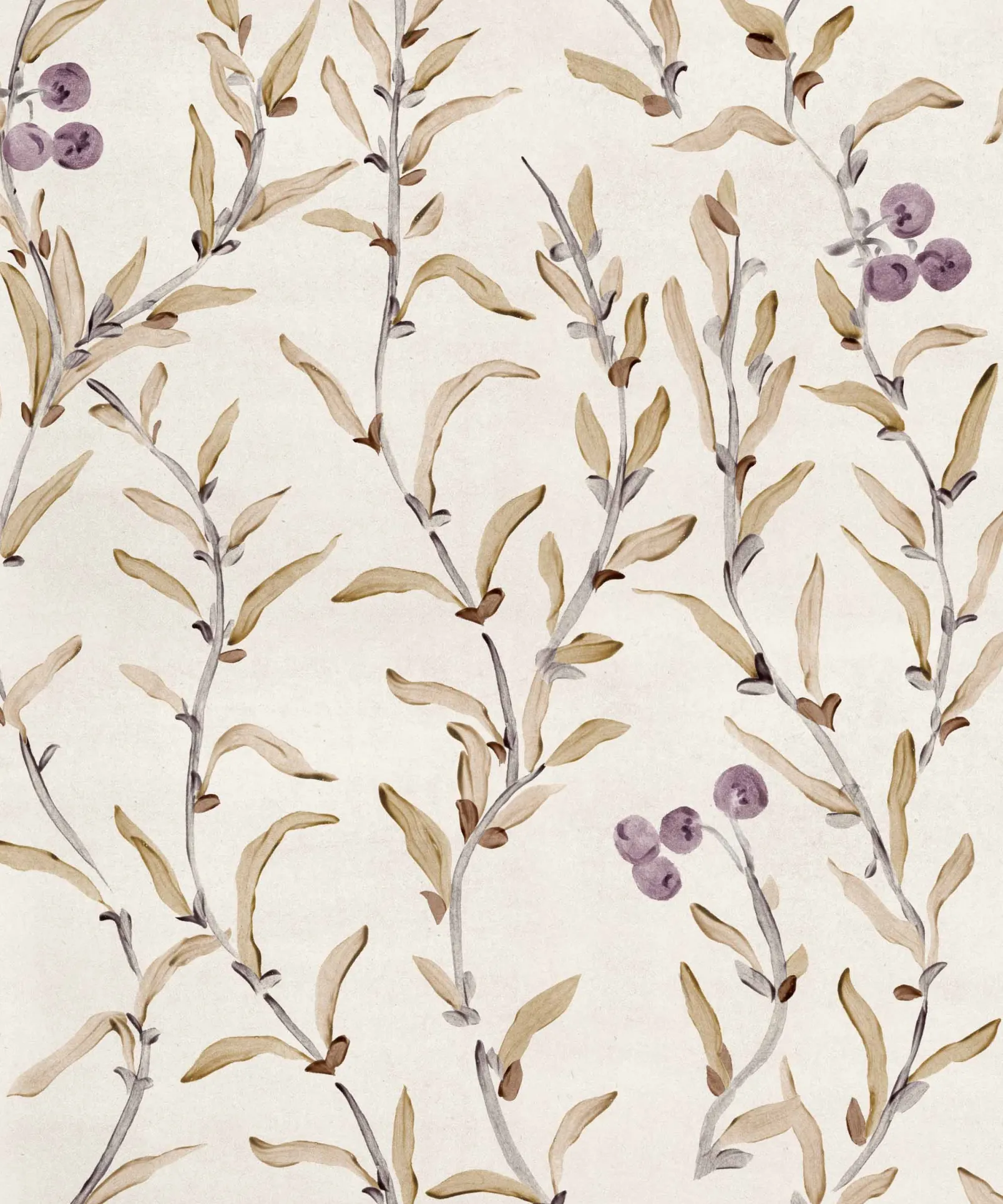 Wild-Blackthorn Prune de Coordonné es un diseño vegetal en blanco/gris de la colección Cotswolds. Deliciosos frutos que aparecen entre ramas delgadas y flexibles cerca de Somerset.