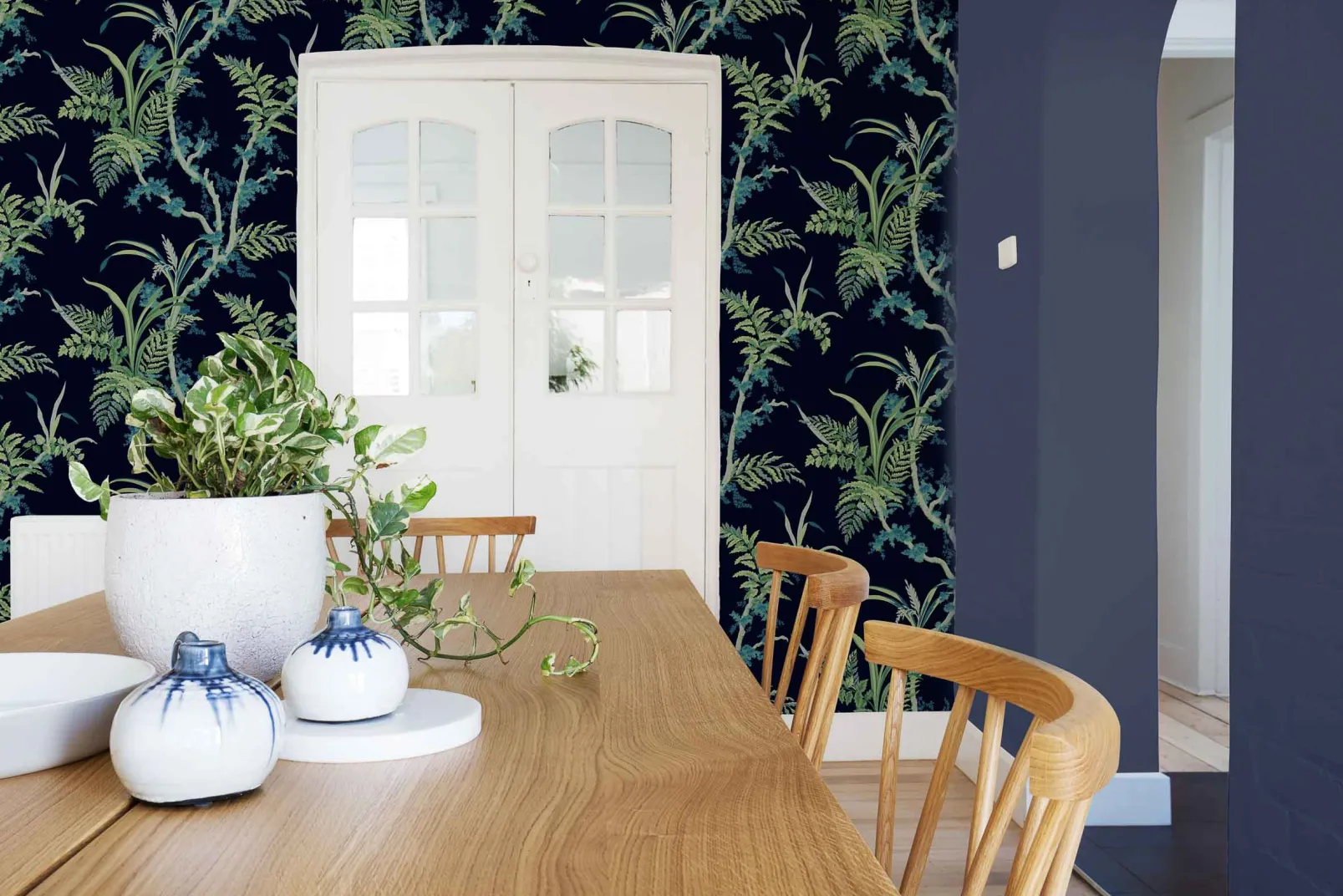 El papel pintado Wild Ferns Navy de Coordonné es un diseño floral en tonos azules/azules de la colección Enchanted.