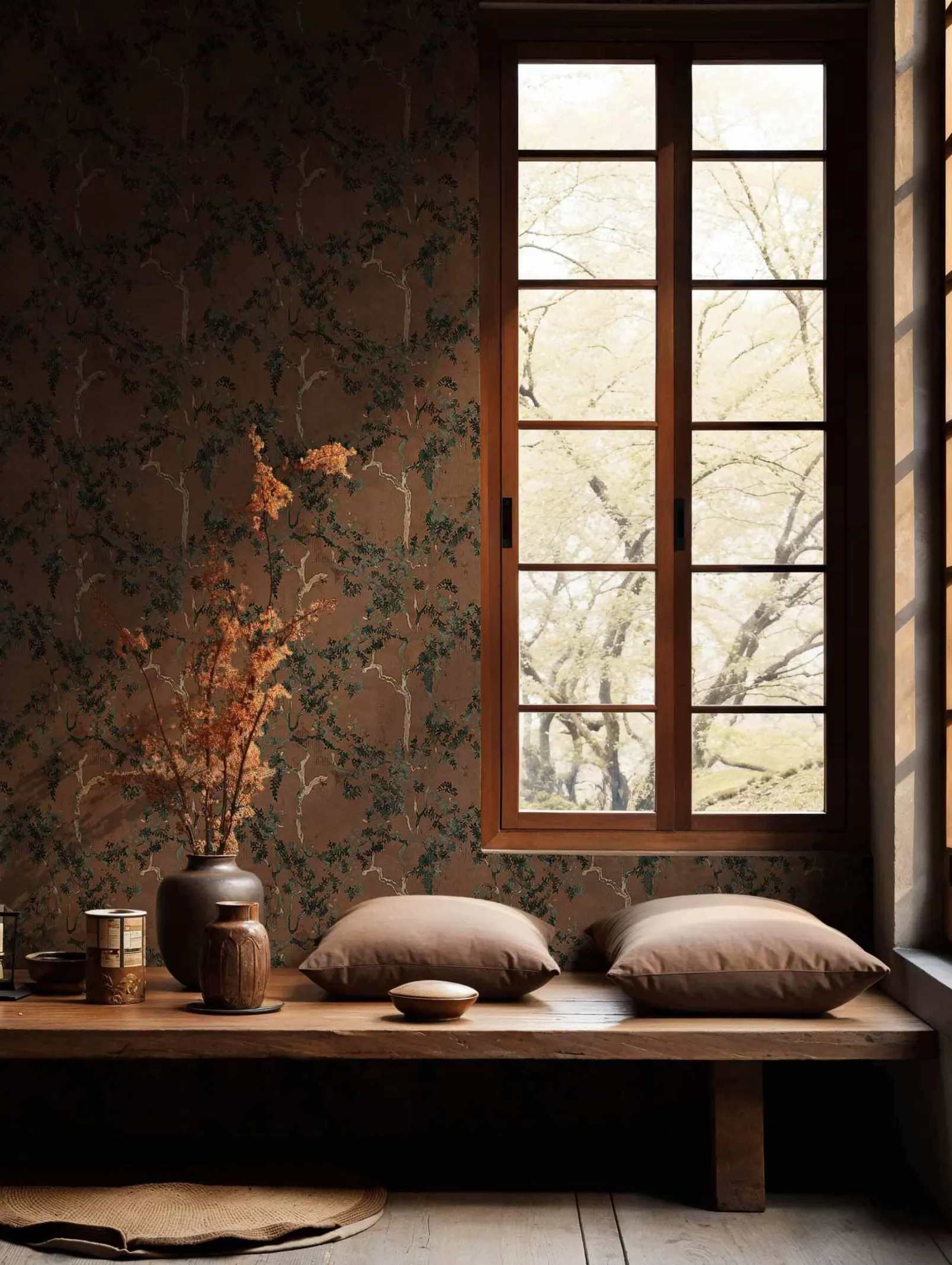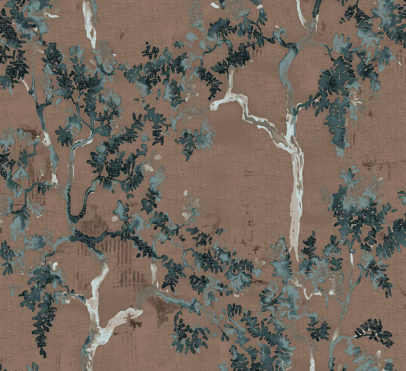 El Poema del Sauce de Yute de Coordonné es un papel pintado marrón. Los sauces que lloraban entre las densas nubes.