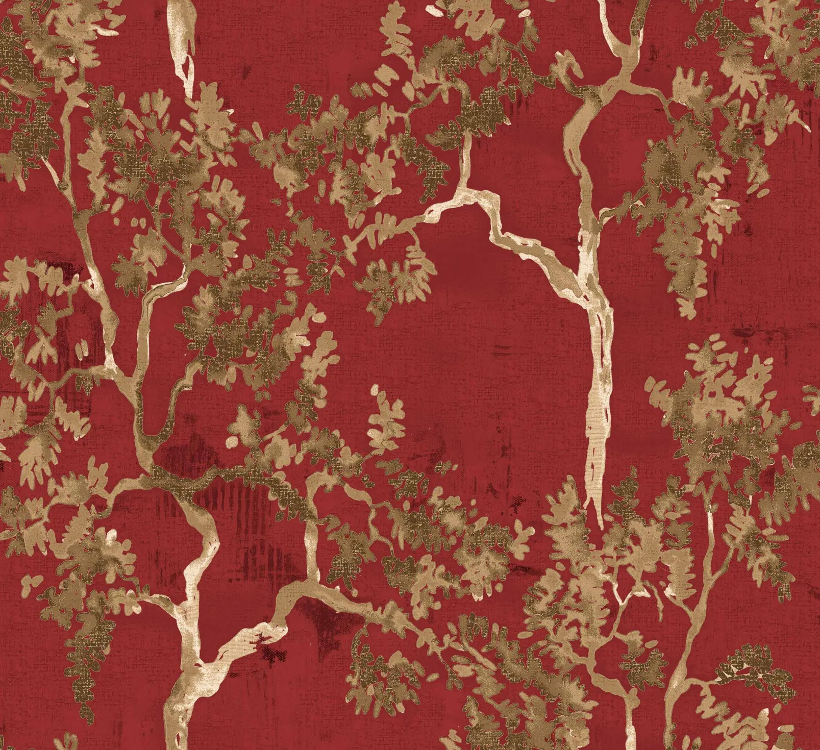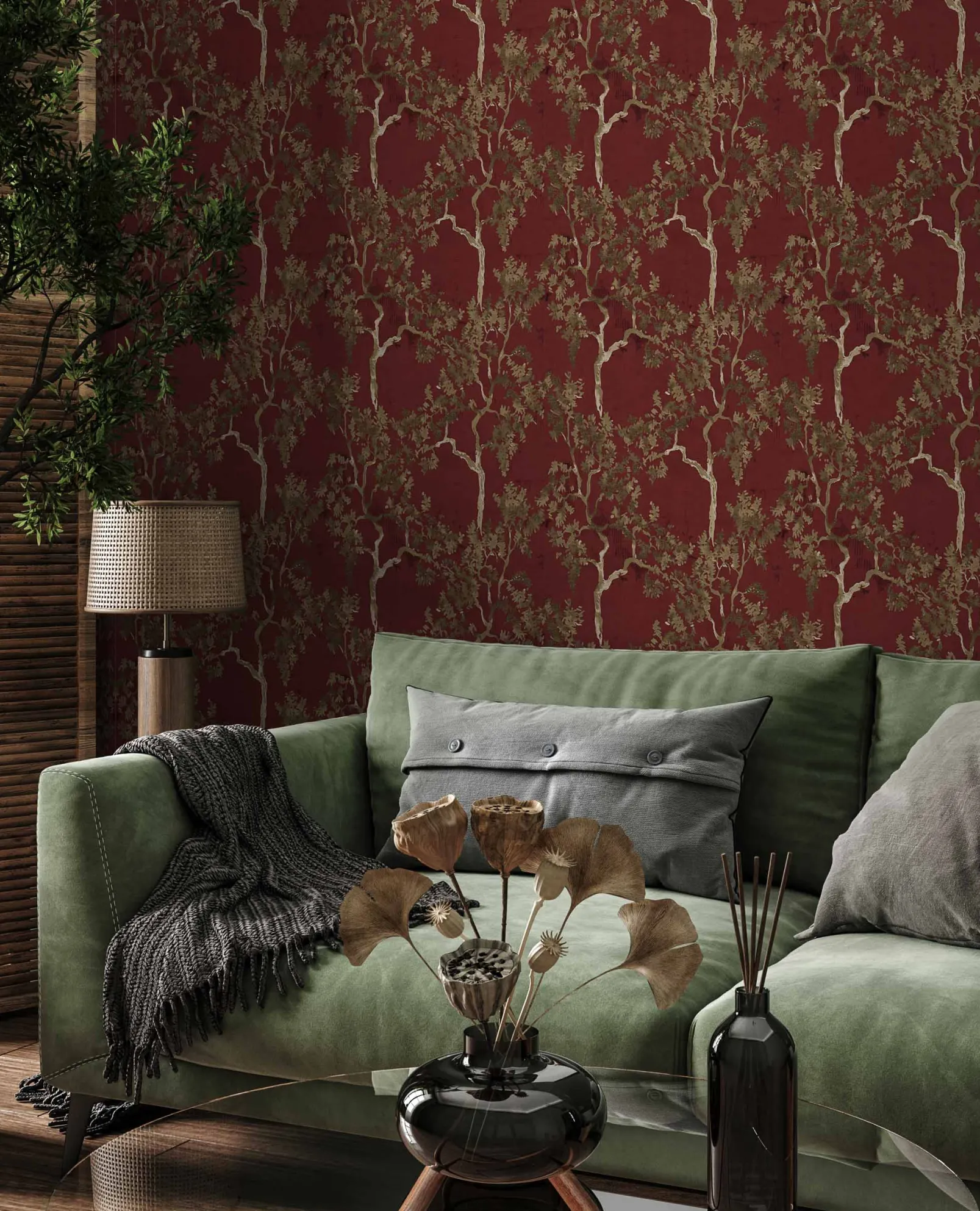 El Poema del Sauce Rubí de Coordonné es un papel pintado rojo/vino.Los sauces que lloraban entre las densas nubes.