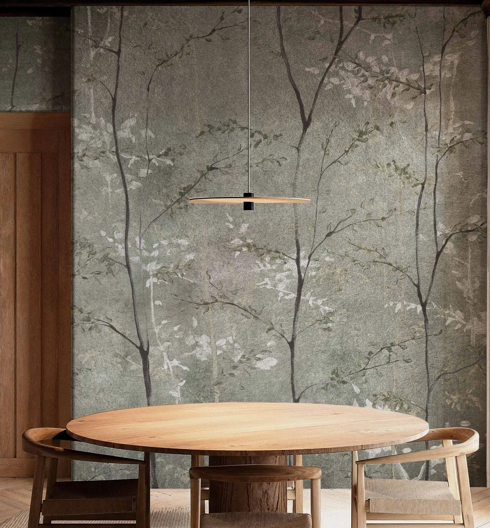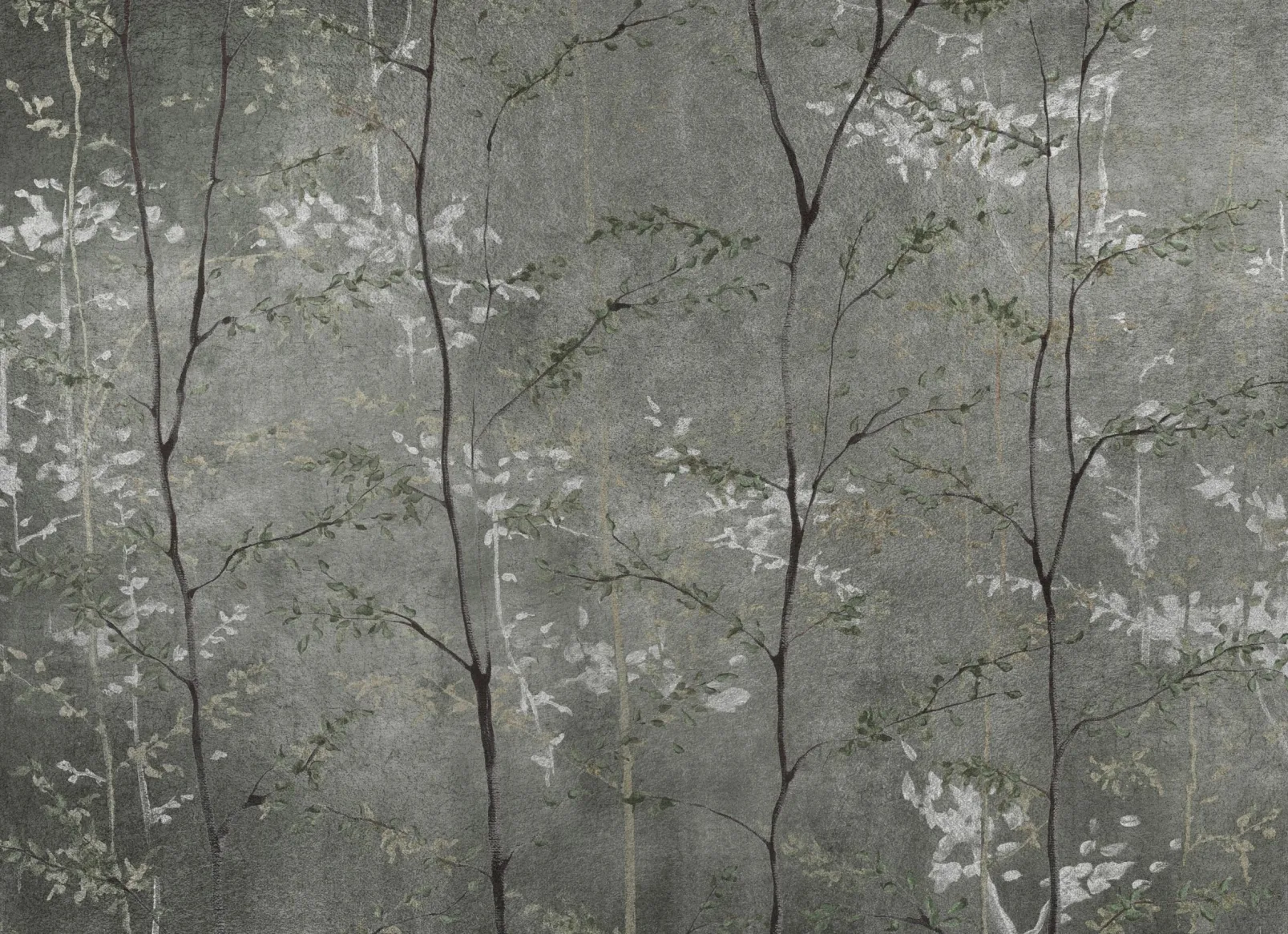 Woods Extra Silver de Coordonné es un diseño vegetal en blanco/gris de la colección Random Metallics II. Ramas que se elevan infinitamente, despojadas de sus hojas.