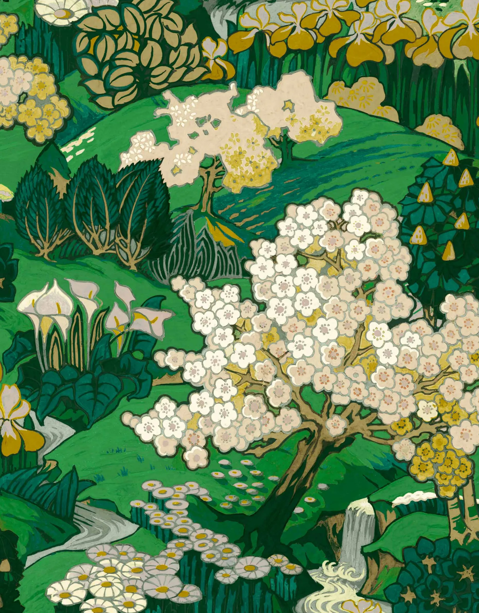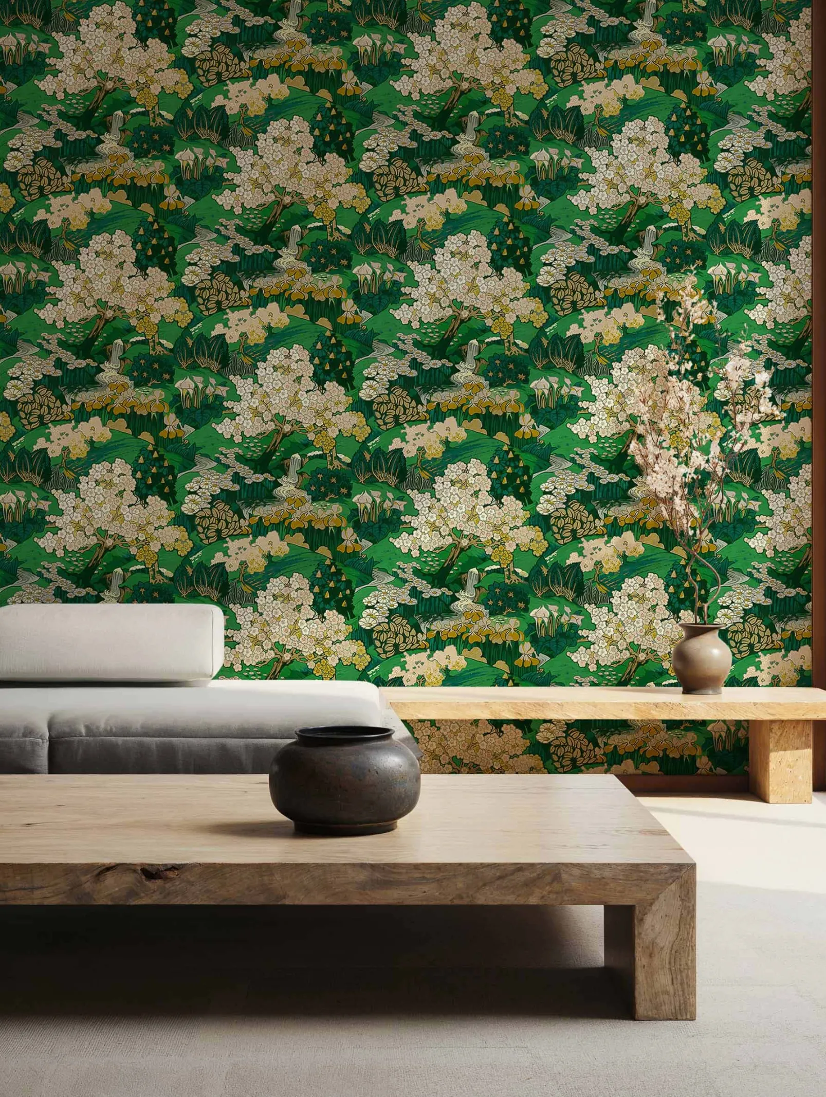 Yu Garden Emerald de Coordonné es un papel pintado verde con tonos blancos.