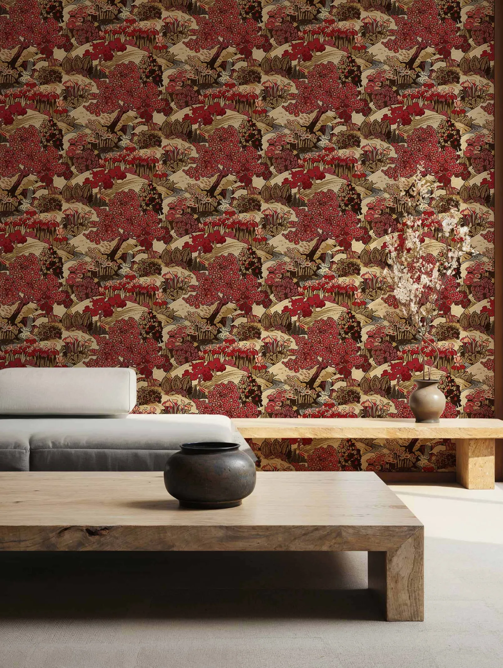 Yu Garden Ruby de Coordonné es un papel pintado rojo con tonos beige.
